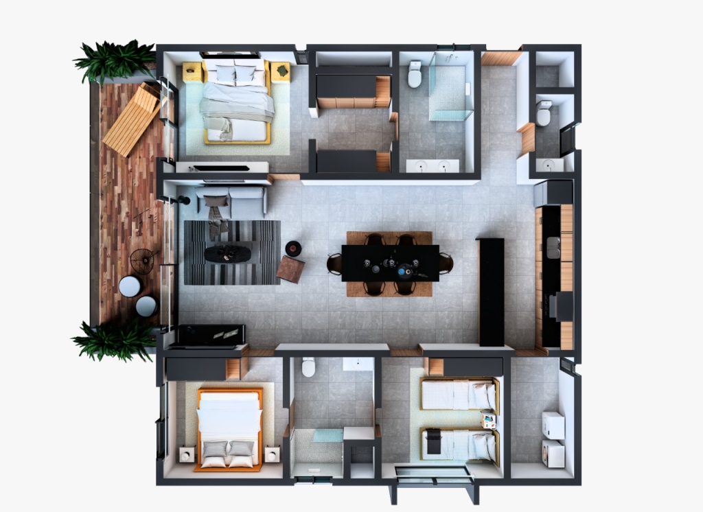 Estrena departamento en renta en Areka Towers de 175 m2 en planta baja con terraza y pasillo lateral con vista a la alberca.