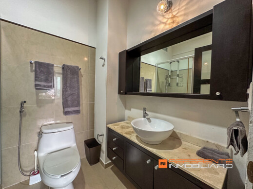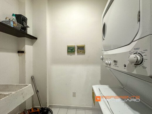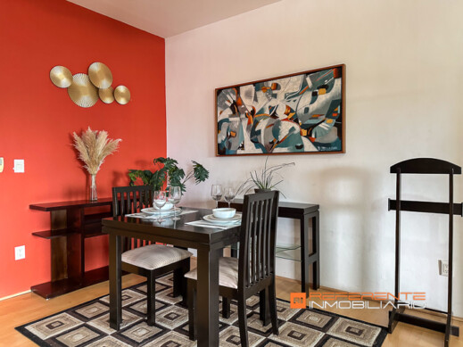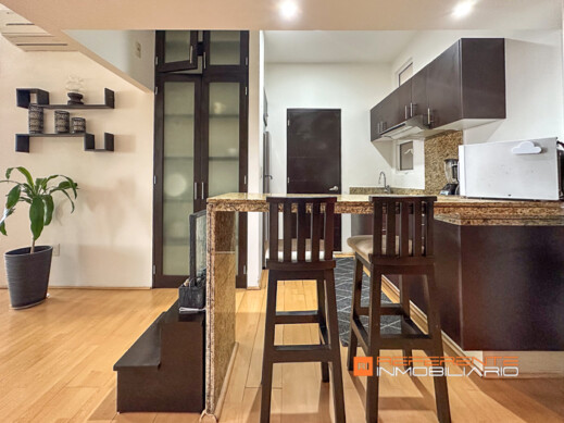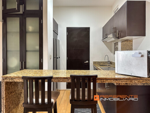 Cuenta con dos sofás, mesa de centro, comedor de 4 sillas, cocina con estufa de inducción, campana, refrigerador y barra de granito con dos sillas altas para desayunar más baño de visitas.